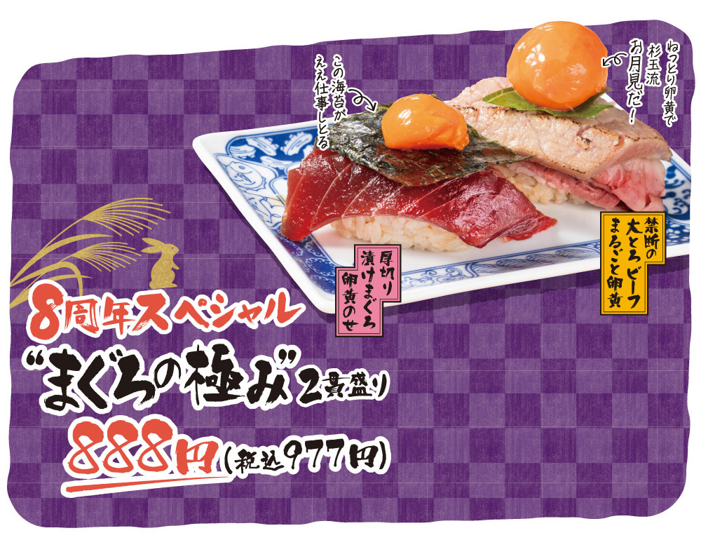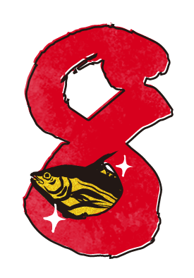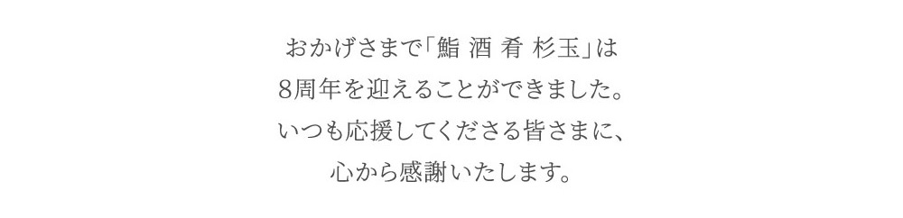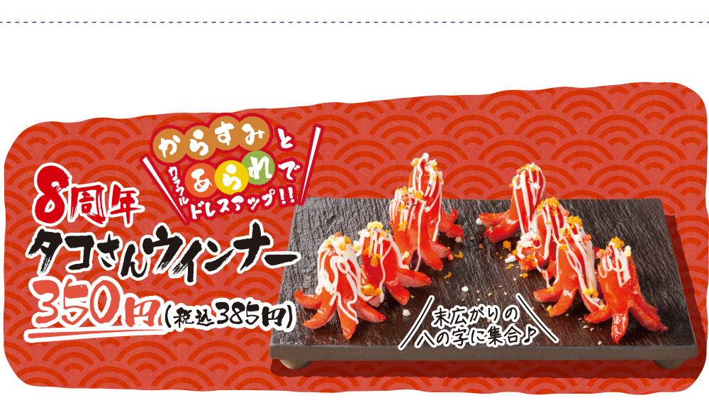 これぞ杉玉の遊び心!8周年だョ!タコさん集合!と声をかけたら、バッチリ8匹集いました。からすみとカラフルなあられでデコレーション。縁起が良さそうな、末広がりの隊列で8周年をお祝いします。