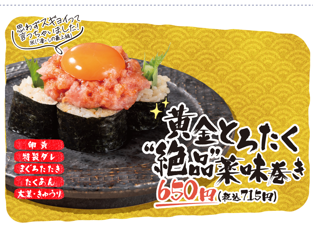 中とろ、赤身、ねぎまぐろを叩いたとろたくと、大葉やきゅうりなどを巻いた薬味巻きの食感のコントラストが絶妙。そこに黄金色に輝く卵黄の包容力…言葉で説明してもきっと伝わらない。だからとにかく食べてほしい!!