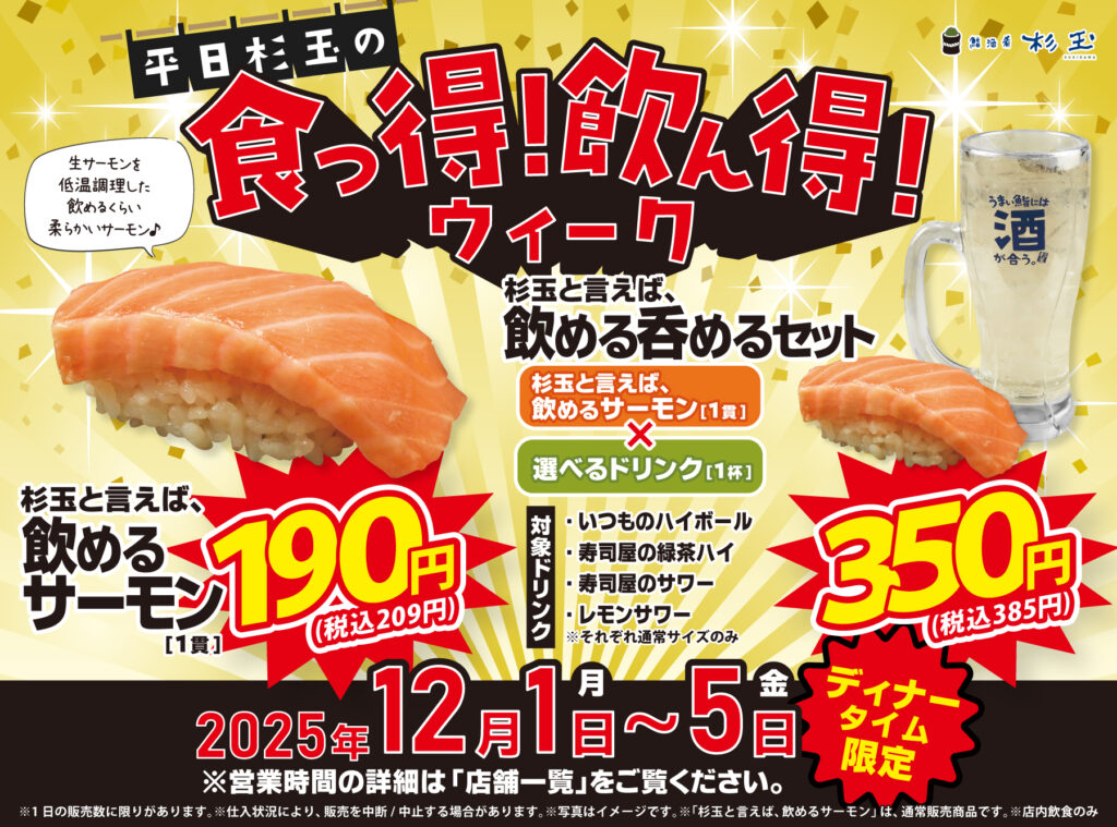 12月1~5日のディナータイム限定☆『平日杉玉の食っ得!飲ん得!ウィーク』